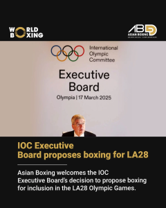 Asian Boxing expresses strong support for the decision of the Executive Board (EB) of the International Olympic Committee (IOC) to propose the inclusion of boxing in the sports programme for the 2028 Olympic Games in Los Angeles (LA28). The proposal will be presented to the 144th Session of the IOC, which is set to take […]